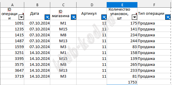 На 3 листе применив фильтры, найдем ID магазинов. На листе движение товаров найдем количество проданного варенца с период с 5 по 14 октября, поступившего в продажу в магазинах М1, М13, М3, М8, М15.