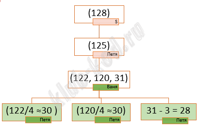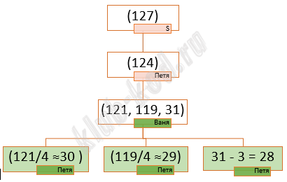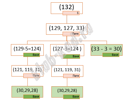 Задание 19. Выигрышная стратегия Два игрока, Петя и Ваня, играют в следующую игру. Перед игроками лежит куча камней. Игроки ходят по очереди, первый ход делает Петя. За один ход игрок может: – убрать из кучи 3 камня; Например, из кучи в 20 камней за один ход можно получить кучу из 17, 15 или 5 камней. Игра завершается, когда количество камней в куче становится не более 30. Победителем считается игрок, сделавший последний ход, то есть первым получивший кучу из 30 или менее камней. В начальный момент в куче было S камней, S ≥ 31. Будем говорить, что игрок имеет выигрышную стратегию, если он может выиграть при любых ходах противника. Укажите минимальное значение S, при котором Петя не может выиграть за один ход, но при любом ходе Пети Ваня может выиграть своим первым ходом. |