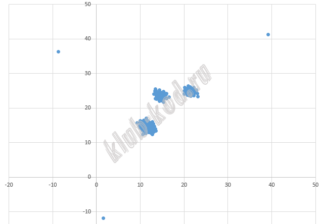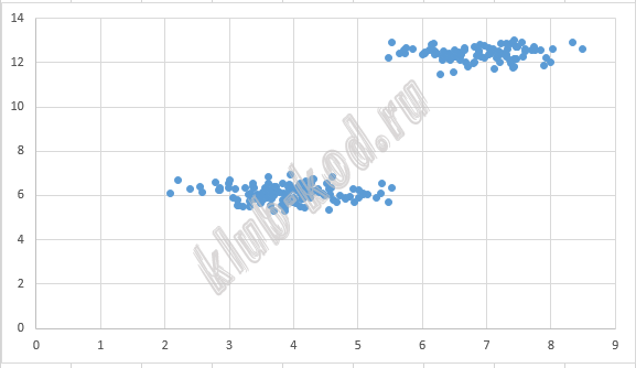 Решение и ответ В электронных таблицах по данным координатам построим точечные диаграммы, получим наглядное представление о кластерах.