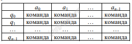 Задание 12. Выполнение алгоритмов для исполнителей Исполнитель МТ представляет собой читающую и записывающую головку, которая может передвигаться вдоль бесконечной горизонтальной ленты, разделённой на равные ячейки. В каждой ячейке находится ровно один символ из алфавита исполнителя (множество символов A = {a0, a1, …, an–1}), включая специальный пустой символ a0. Время работы исполнителя делится на дискретные такты (шаги). На каждом такте головка МТ находится в одном из множества допустимых состояний Q = {q0, q1, …, qn–1}. В начальный момент времени головка находится в начальном состоянии q0. На каждом такте головка обозревает одну ячейку ленты, называемую текущей ячейкой. За один такт головка исполнителя может переместиться в ячейку справа или слева от текущей, не меняя находящийся в ней символ, и/или заменить символ в текущей ячейке без сдвига в соседнюю ячейку. После каждого такта головка переходит в новое состояние или остаётся в прежнем состоянии. Программа работы исполнителя МТ задаётся в табличном виде.