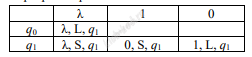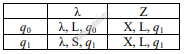 В первой строке перечислены все возможные символы в текущей ячейке ленты, в первом столбце – возможные состояния головки. На пересечении i-й строки и j-го столбца находится команда, которую выполняет МТ, когда головка обозревает j-й символ, находясь в i-м состоянии. Если пара «символ – состояние» невозможна, то клетка для команды остаётся пустой. Каждая команда состоит из трёх элементов, разделённых запятыми: первый элемент – записываемый в текущую ячейку символ алфавита (может совпадать с тем, который там уже записан). Второй элемент – один из четырёх символов «L», «R», «N», «S». Символы «L» и «R» означают сдвиг в левую или правую ячейки соответственно, «N» – отсутствие сдвига, «S» – завершение работы исполнителя МТ после выполнения текущей команды. Сдвиг происходит после записи символа в текущую ячейку. Третий элемент – новое состояние головки после выполнения команды. Например, команда 0, L, q3 выполняется следующим образом: в текущую ячейку записывается символ «0», затем головка сдвигается в соседнюю слева ячейку и переходит в состояние q3. Приведём пример выполнения программы, заданной таблично. На ленте записано неизвестное ненулевое количество расположенных подряд в соседних ячейках символов «Z», все остальные ячейки ленты заполнены пустым символом «λ». В начальный момент времени головка находится на неизвестном ненулевом расстоянии справа от самого правого символа «Z». Программа