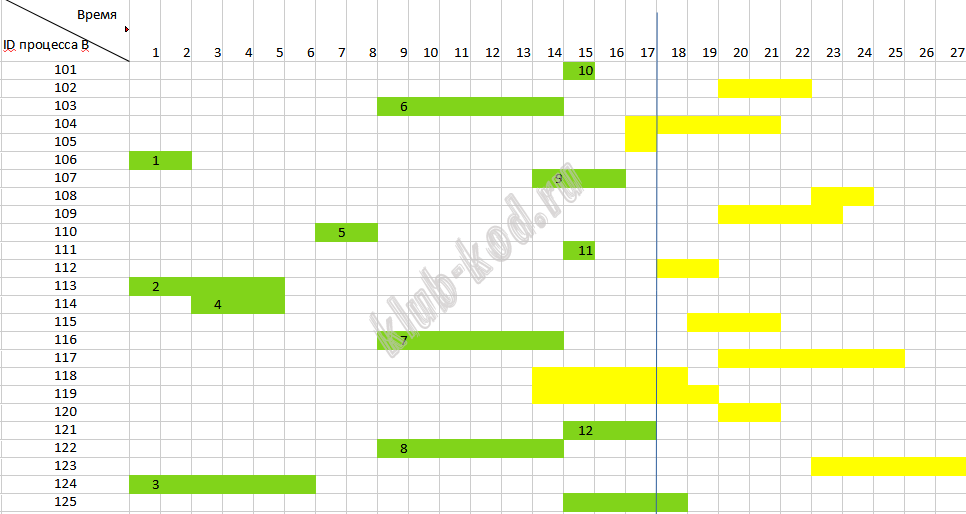 Для приведённой таблицы процесс 3 начинается на 8-й мс, заканчивается на 9-й. Типовой пример имеет иллюстративный характер. Для выполнения задания используйте данные из прилагаемого файла. |