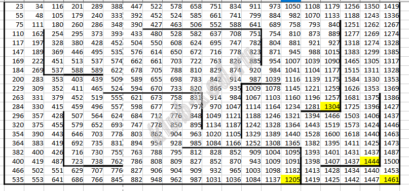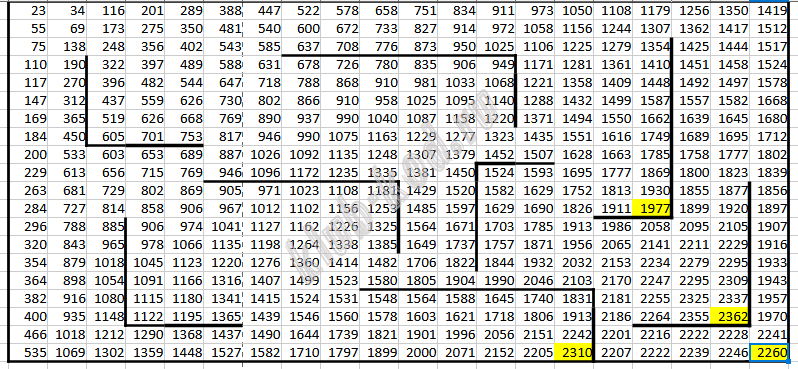 АВ2 = МАКС(АВ1;АА2)+B2 и протягиваем на всю таблицу копируя только значения, стенки не трогаем. Затем копируем формулы в верхней строке соответствующих ячеек и заполняем под стенами, копируем формулы в первом столбце соответствующих ячеек и заполняем ячейки правее стенок. Находим максимальное значение из трех тупиковых клеток. Это 2362.