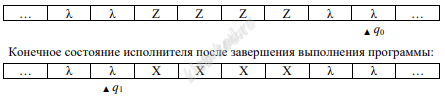 заменяет на ленте все символы «Z» на «X» и останавливает исполнителя в первой ячейке слева от последовательности символов «X». Возможное начальное состояние исполнителя: