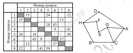 Так как таблицу и схему рисовали независимо друг от друга, нумерация населённых пунктов в таблице никак не связана с буквенными обозначениями на графе. Определите, какова сумма протяжённостей дорог из пункта G в пункт E и из пункта F в пункт H. В ответе запишите целое число. |
