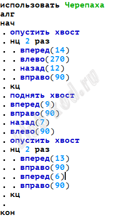 Задание 6. Анализ программ Исполнитель Черепаха действует на плоскости с декартовой системой координат. В начальный момент Черепаха находится в начале координат, её голова направлена вдоль положительного направления оси ординат, хвост опущен. При опущенном хвосте Черепаха оставляет на поле след в виде линии. В каждый конкретный момент известно положение исполнителя и направление его движения. У исполнителя существует 6 команд: Черепахе был дан для исполнения следующий алгоритм: Определите, сколько точек с целочисленными координатами находятся внутри объединения фигур, ограниченных заданными алгоритмом линиями, включая т·очки на линиях. |